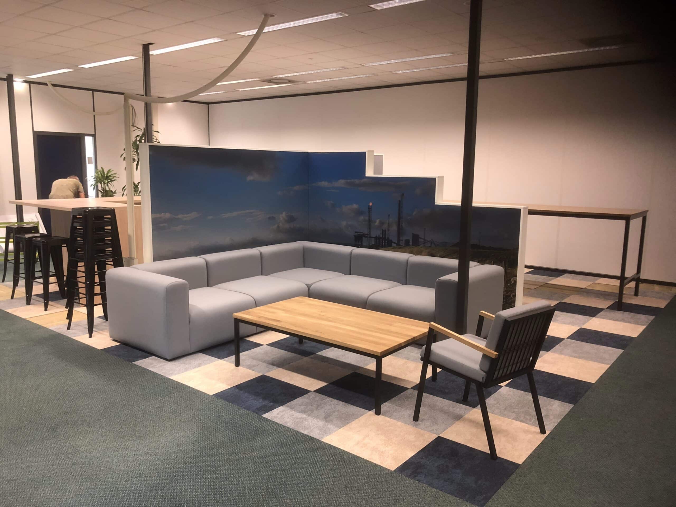 Voor een gewaardeerde relatie hebben we een warme en functionele vergaderruimte gerealiseerd. In samenwerking met een architect hebben we voor een groot metaalbedrijf in Velsen-Noord een sfeervolle vergaderruimte ontworpen. De ruimte is ingericht met meerdere vergadereilandjes en een akoestische scheidingswand, stijlvol afgewerkt met een gepersonaliseerde stoffering met foto.